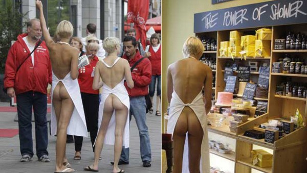 24-летняя Александра Куммер (Alexandra Kummer) работает в магазине Lush на Александерплац. Фото: Reuters. Европейские маркетологи не устают нас удивлять. Компания Lush, продающая косметические средства почти без упаковки, решила донести идею «голых продуктов» до потребителей максимально доступным способом — раздев продавцов. 13 августа сотрудницы берлинского магазина Lush в одних фартуках обслуживали покупателей, чему те, судя по всему, были несказанно рады.