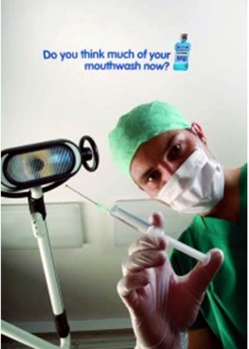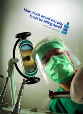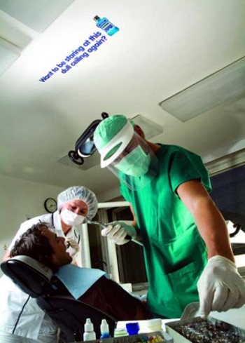 Совершенно стопроцентное попадание в целевую аудиторию совершило агентство EURO RSCG, Prague, разместив стикеры с рекламой противокариесного ополаскивателя для рта над креслами в стоматологических клиниках. Надпись на потолке гласит: «Хочешь снова уставиться в этот унылый потолок?» «Теперь ты будешь больше думать о своем ополаскивателе рта?» «Что ты готов отдать, чтобы не сидеть здесь?» |