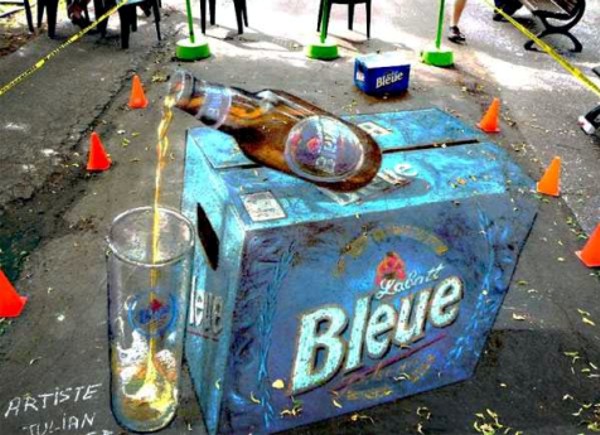 Ambient-media - реклама пива "Bleue" на асфальте от Julian Beever. Пример 9.