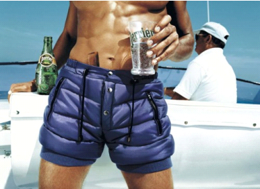 Основная тема принтов - освежающий эффект этой воды: чтобы не замерзнуть, люди на пляже одевают шерстяные шапки, теплые шорты, меховые купальники и шерстяные стринги.