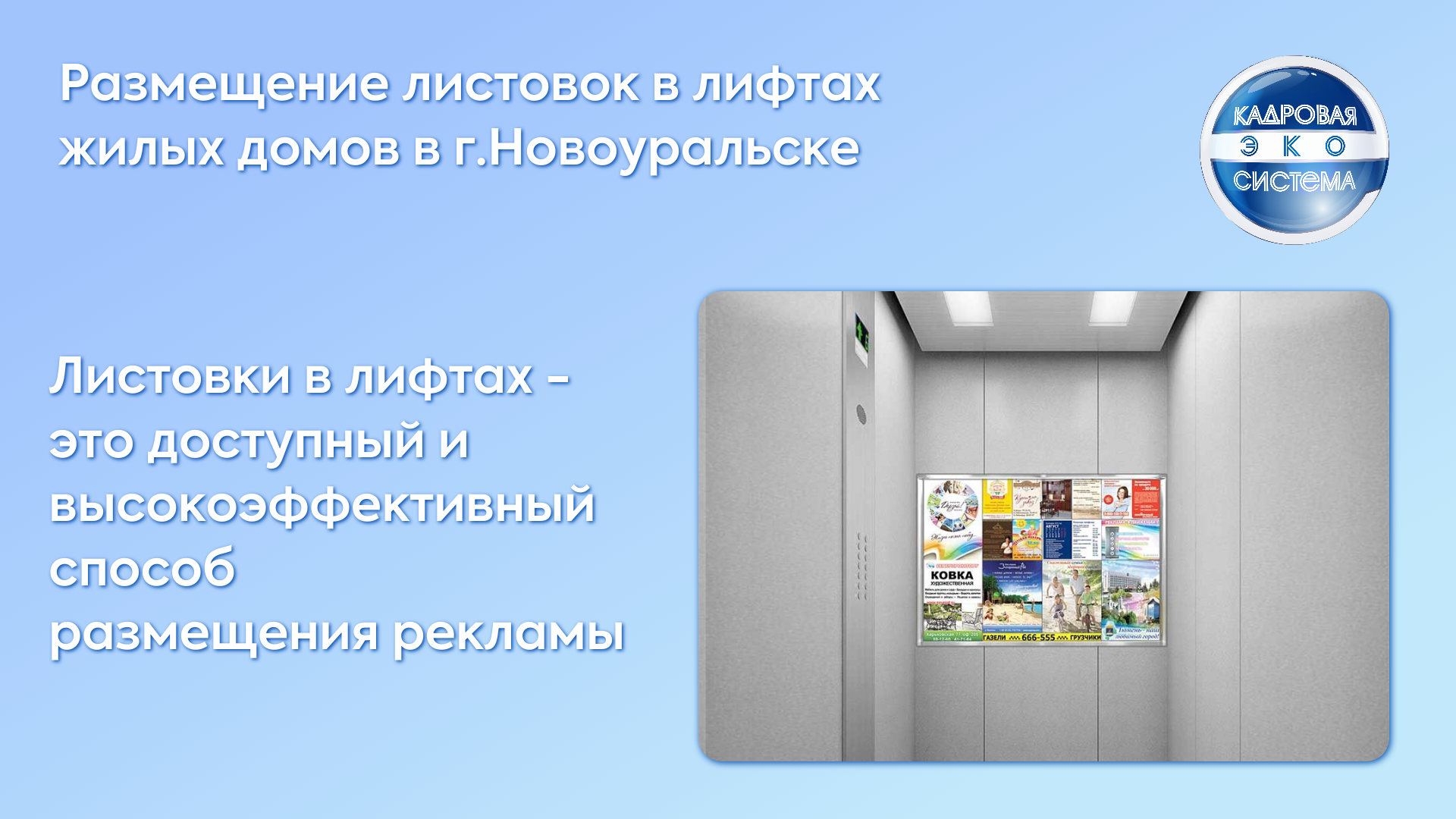 Вы можете быстро и просто разместить листовки в лифтах о найме персонала, объявления о купле–продаже, курсах, акциях и пр. Рекламные листовки в лифтах Новоуральска – точечный охват нужных районов, оперативность и низкая цена печати! Закажите рекламу в лифтах Новоуральска любым способом.